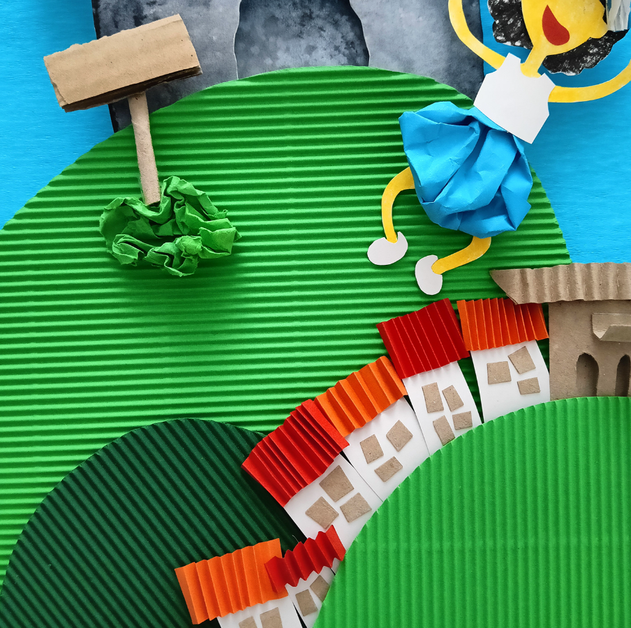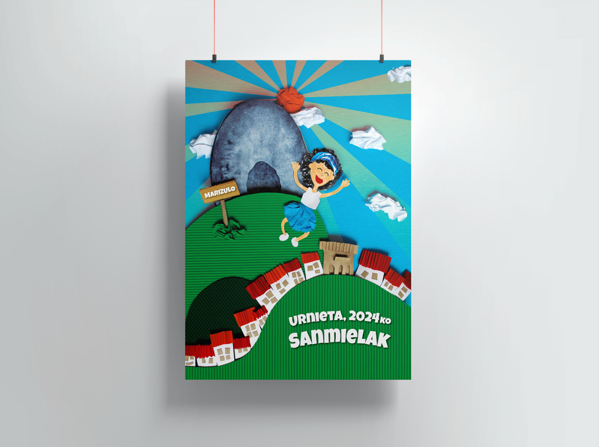 ¿Quién dijo que las ilustraciones deben hacerse necesariamente dibujando con tinta sobre papel? Sentir la textura de los distintos materiales. Cortar, equivocarse y volver a cortar. Poder mover los elementos sobre el lienzo en tiempo real. Crear texturas con pliegues, generar nuevas dimensiones con diferentes capas. Y reciclar. Reutilizar. Ilustrar va mucho más allá de coger un lápiz y ponerse a dibujar. Este cartel hecho a mano ganó el primer premio del concurso de carteles para anunciar las fiestas de Urnieta, un pequeño pueblo situado en el País Vasco.
