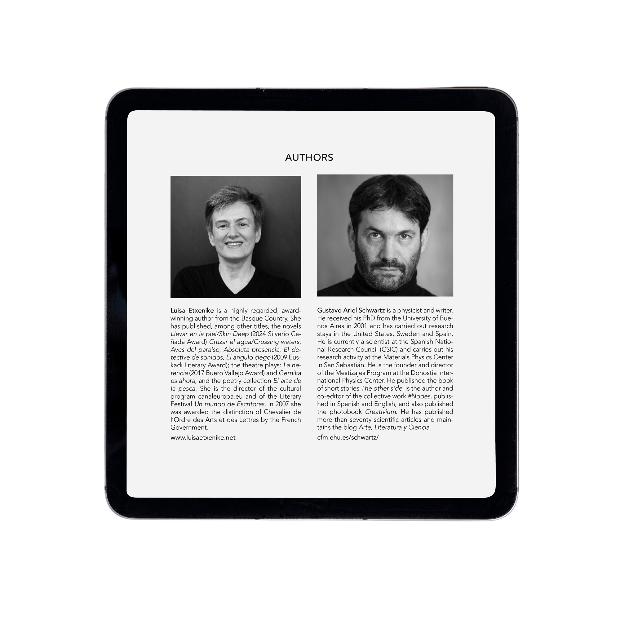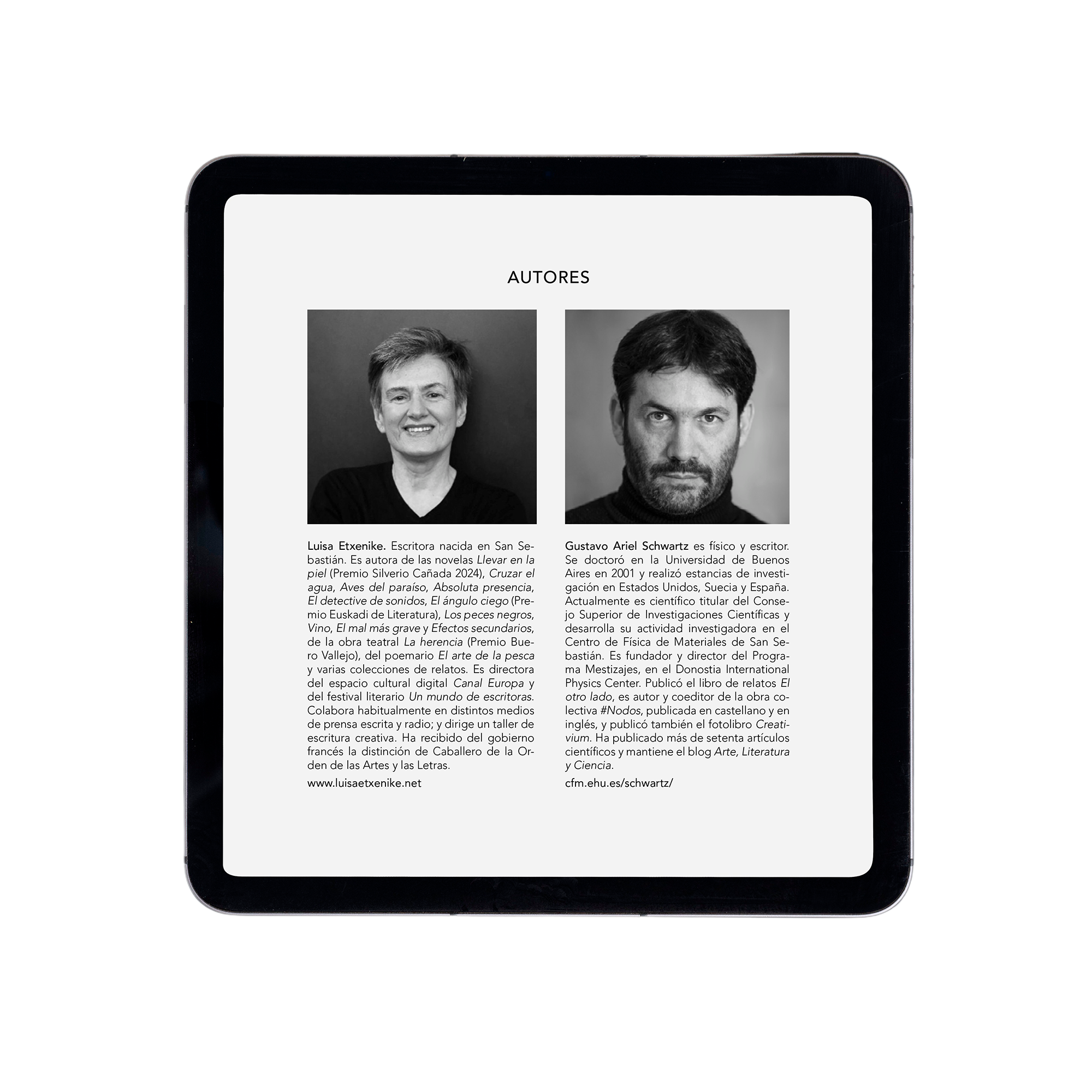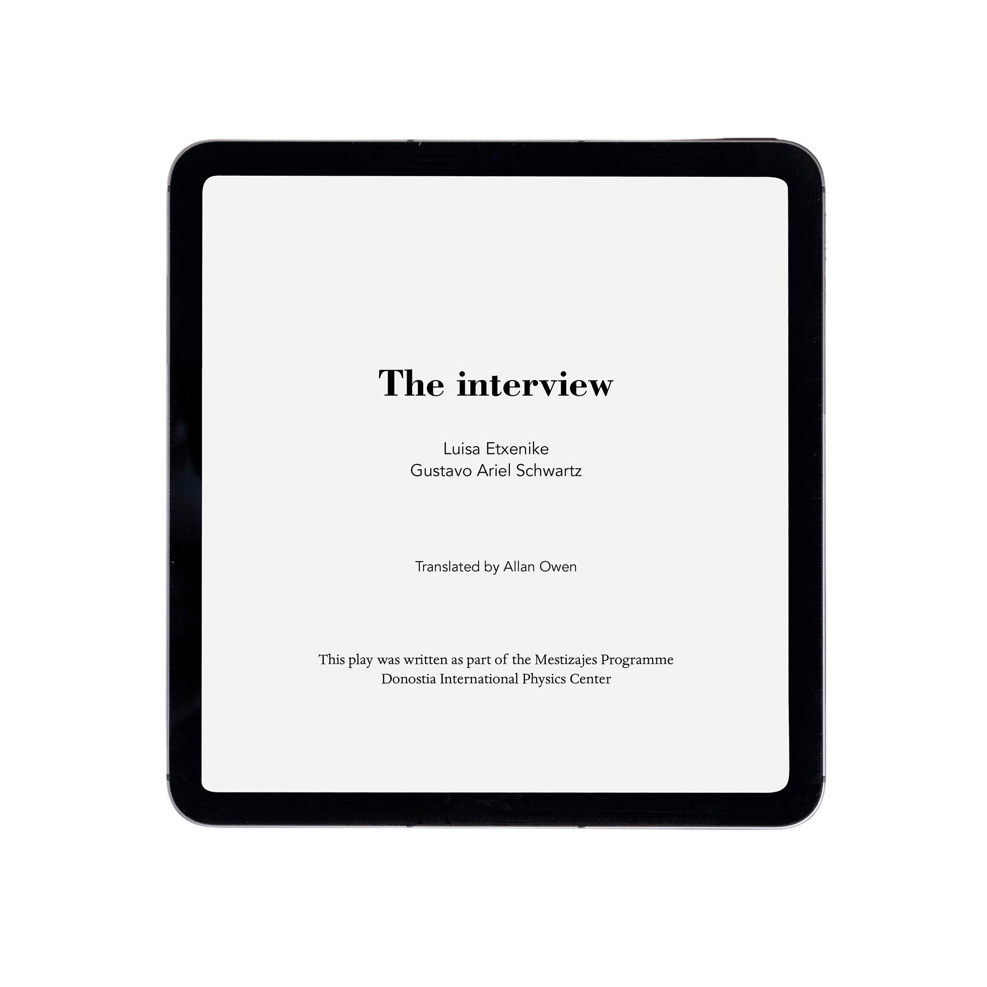 Diseño y maquetación del libro digital "La entrevista" y su versión en inglés "The interview", obra de teatro escrita por la escritora Luisa Etxenike y el físico y escritor Gustavo Ariel Schwartz, dentro del Programa Mestizajes del DIPC (Donostia International Physics Center). Siguiendo el estilo de la versión impresa -publicada en 2016-, el libro se ha diseñado utilizando una tipografía clásica, que aporta refinamiento, a la vez que facilita la lectura. El libro electrónico puede descargarse en la web laentrevista.mestizajes.es, que tuve la oportunidad de diseñar.