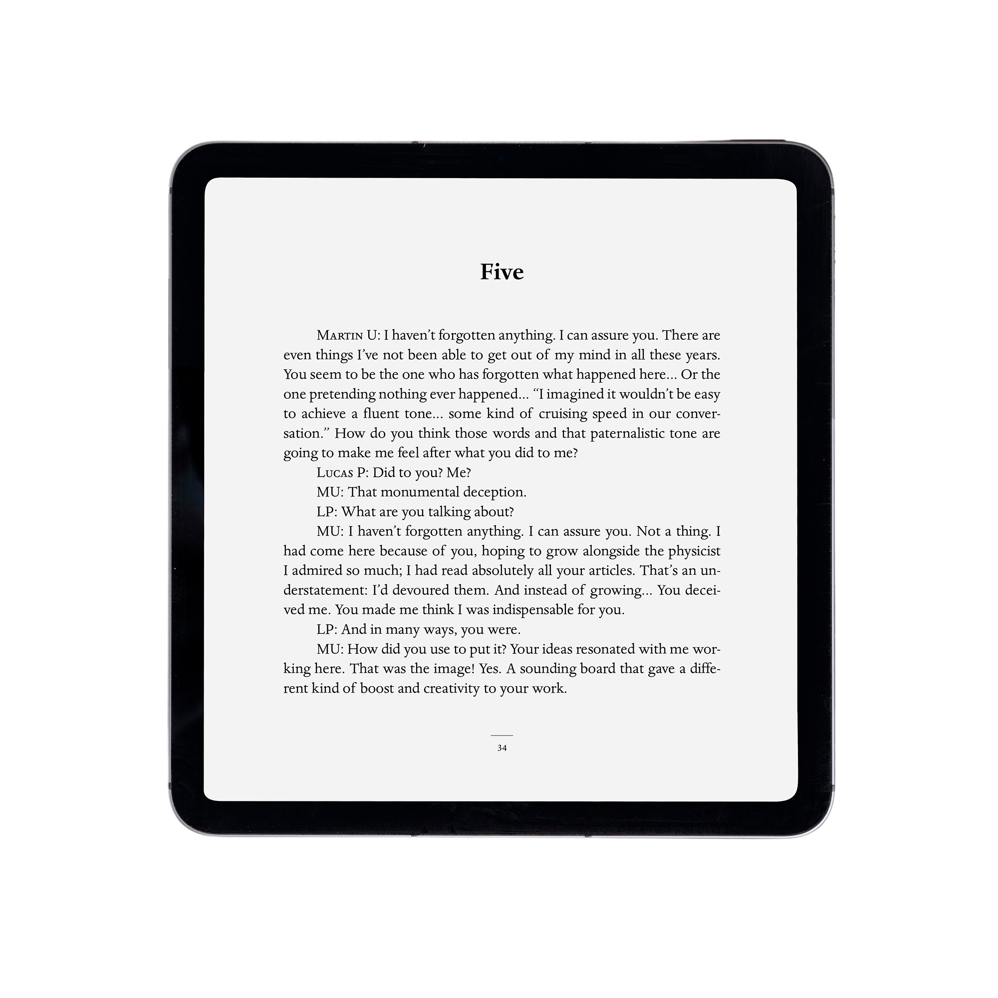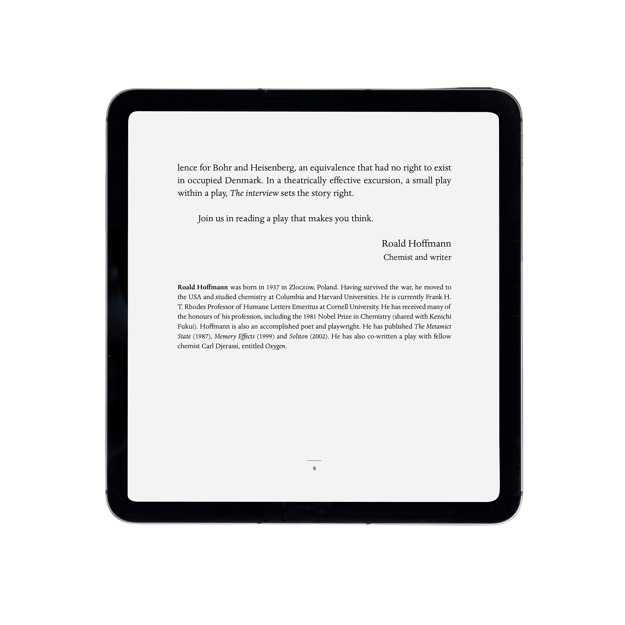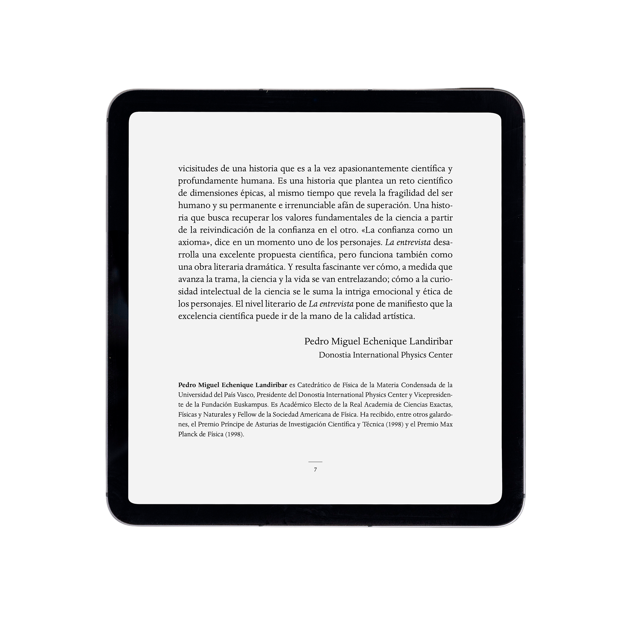 Diseño y maquetación del libro digital "La entrevista" y su versión en inglés "The interview", obra de teatro escrita por la escritora Luisa Etxenike y el físico y escritor Gustavo Ariel Schwartz, dentro del Programa Mestizajes del DIPC (Donostia International Physics Center). Siguiendo el estilo de la versión impresa -publicada en 2016-, el libro se ha diseñado utilizando una tipografía clásica, que aporta refinamiento, a la vez que facilita la lectura. El libro electrónico puede descargarse en la web laentrevista.mestizajes.es, que tuve la oportunidad de diseñar.