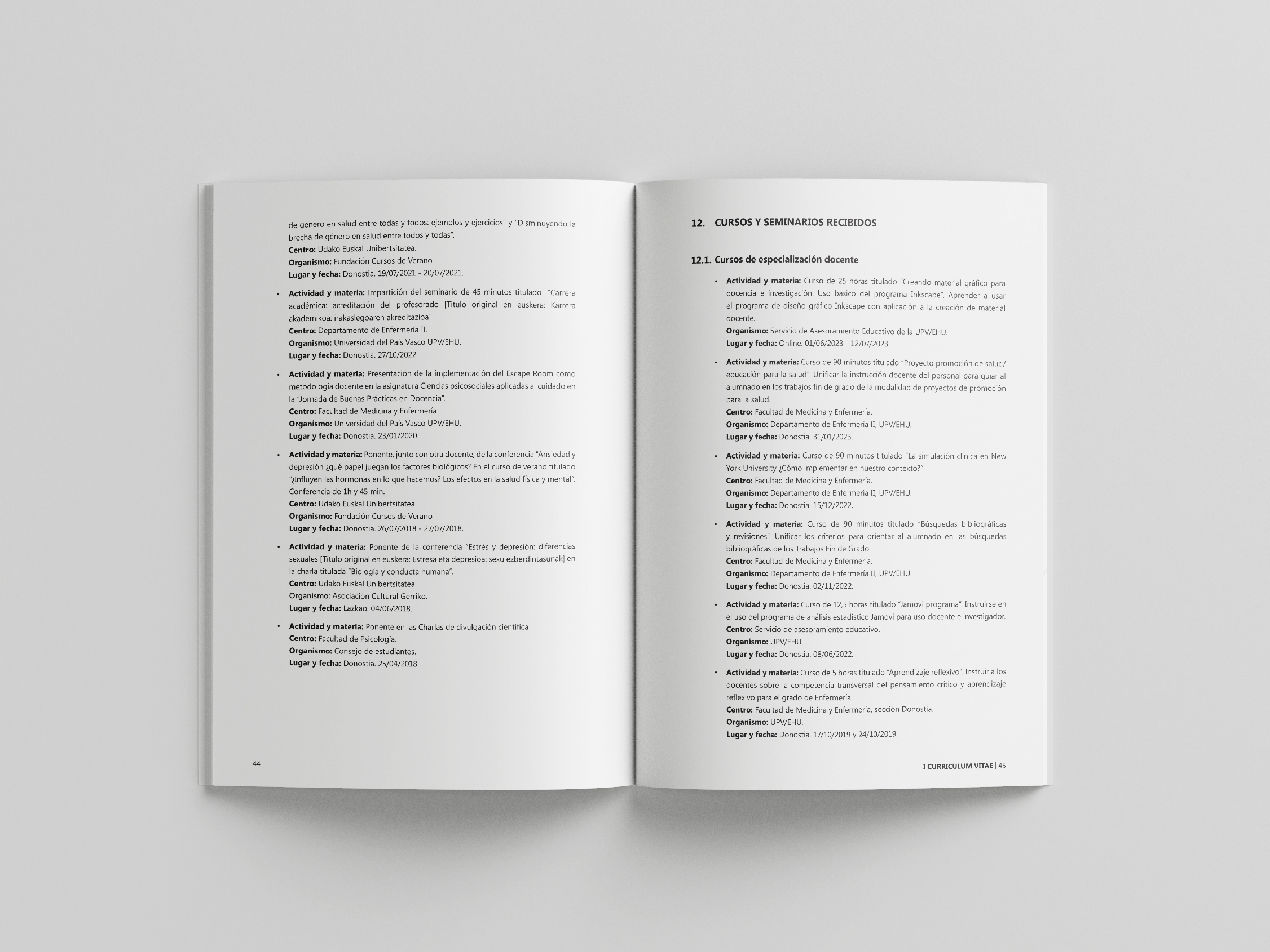Diseño y maquetación, y creación de infografías para el libro del proyecto docente de una profesora de la Facultad de Medicina y Enfermería de la Universidad del País Vasco. Este libro es la recopilación de una larga y fructífera trayectoria en el ámbito científico, y actuó como carta de presentación, currículum vitae y presentación del proyecto docente para una oposición a una plaza fija en la universidad. La estética y el atractivo visual del libro fueron destacados por los miembros del jurado, que se quedaron con un ejemplar para utilizarlo como ejemplo para futuros candidatos.
