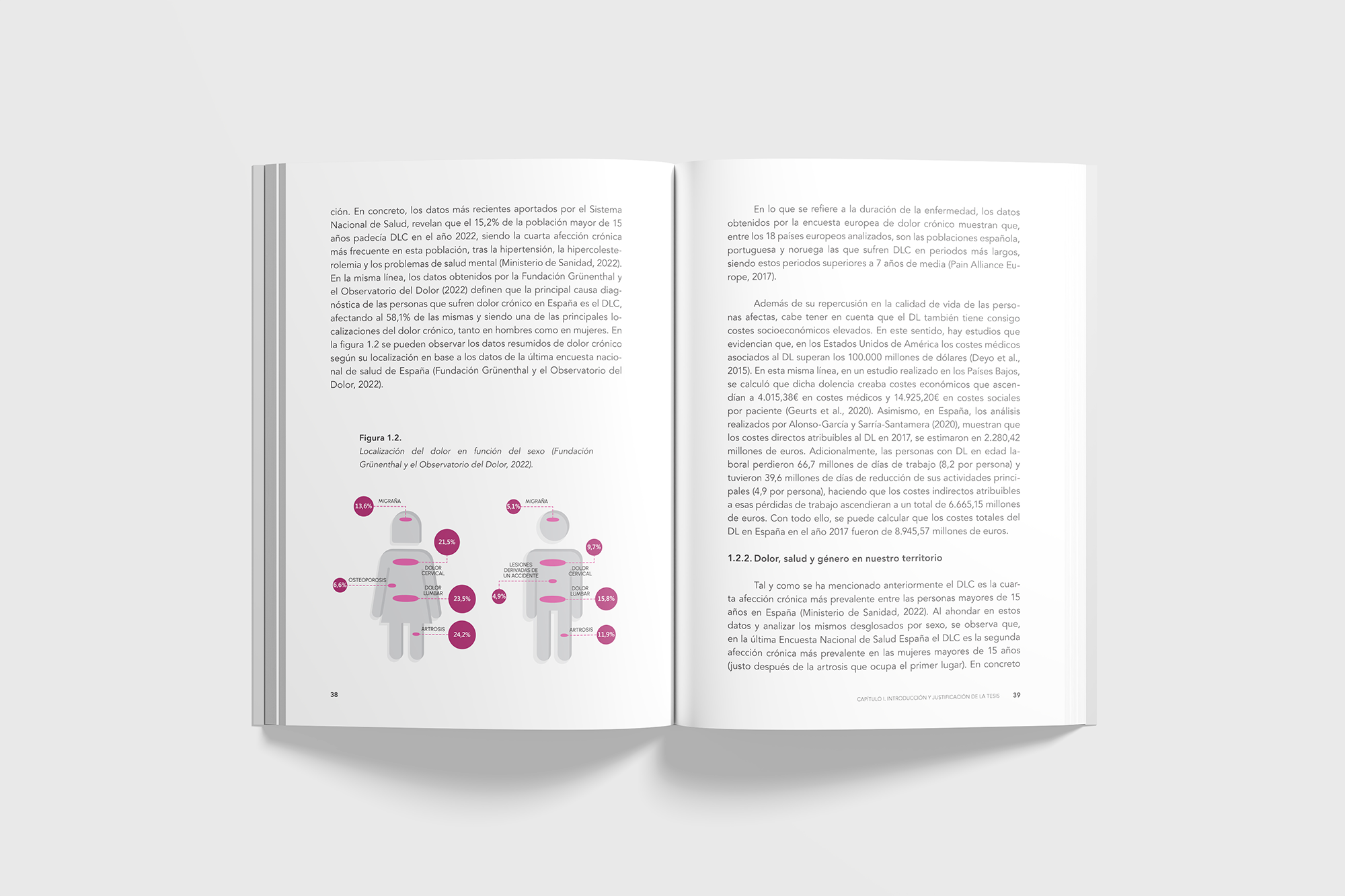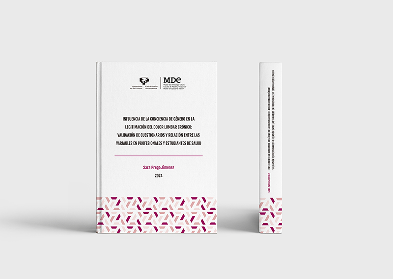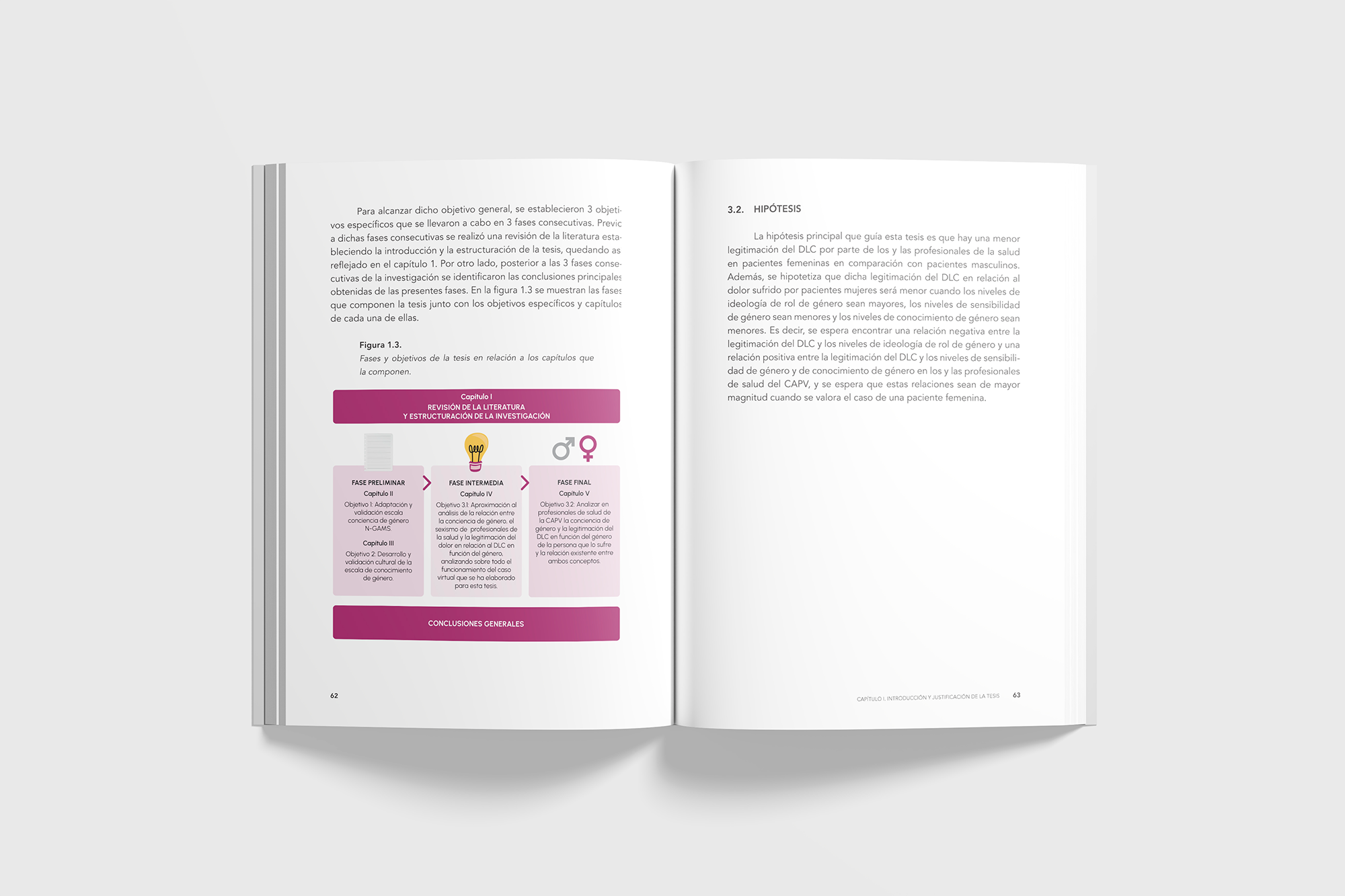 Diseño y maquetación, diseño de portada e infografías para el libro del proyecto de tesis doctoral de una doctoranda de la Facultad de Medicina y Enfermería de la Universidad del País Vasco. La paleta de colores elegida para el patrón de la portada y las portadas interiores simboliza las diferentes escalas de conciencia de género y su influencia en la legitimación del dolor lumbar crónico, mientras que el patrón de triángulos pretende representar cómo esos variados niveles de conciencia se entremezclan y son a menudo intercambiables.