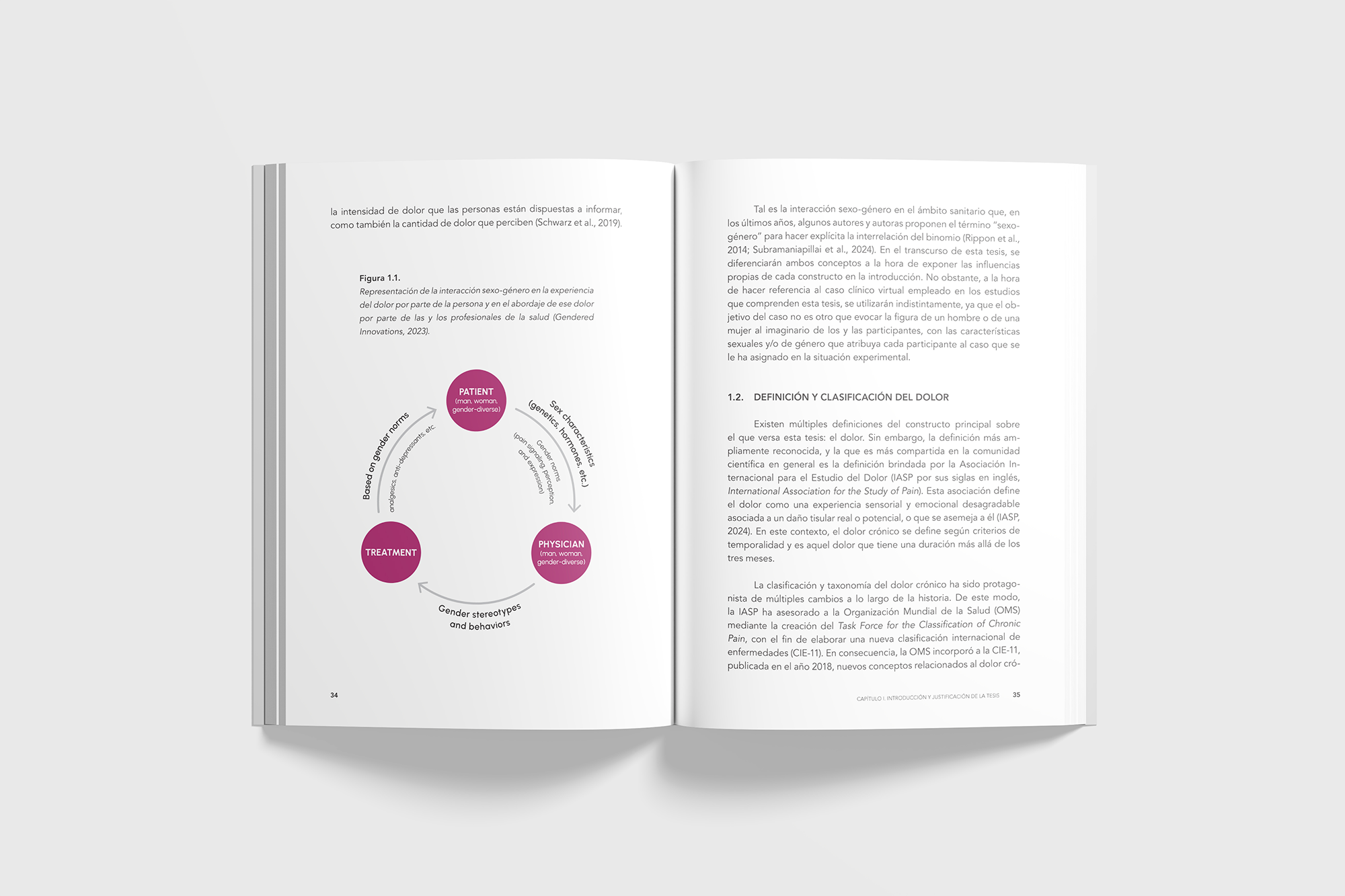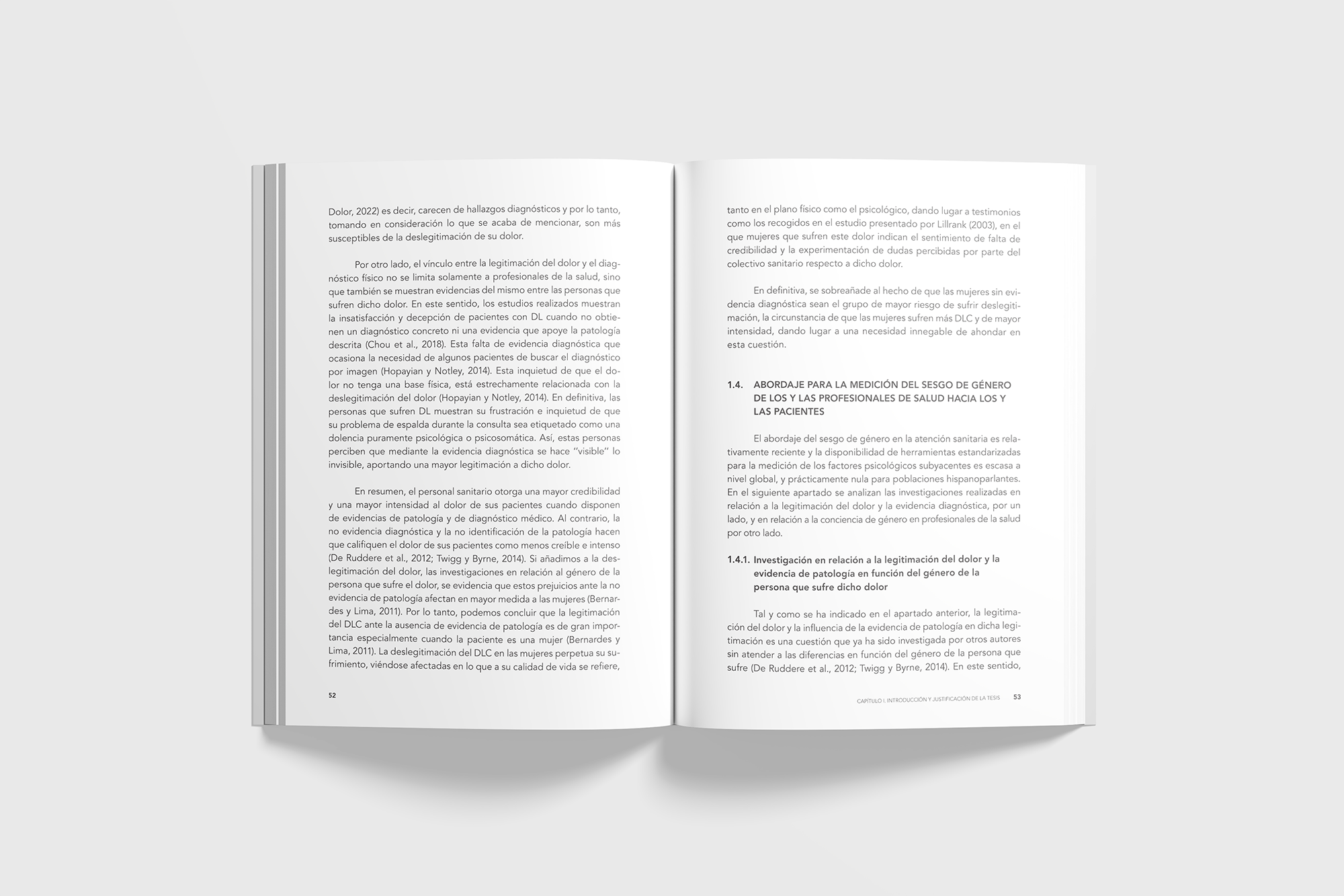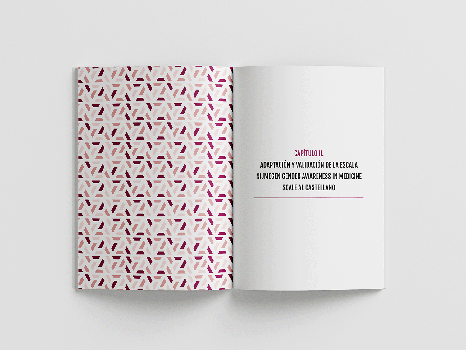 Diseño y maquetación, diseño de portada e infografías para el libro del proyecto de tesis doctoral de una doctoranda de la Facultad de Medicina y Enfermería de la Universidad del País Vasco. La paleta de colores elegida para el patrón de la portada y las portadas interiores simboliza las diferentes escalas de conciencia de género y su influencia en la legitimación del dolor lumbar crónico, mientras que el patrón de triángulos pretende representar cómo esos variados niveles de conciencia se entremezclan y son a menudo intercambiables.